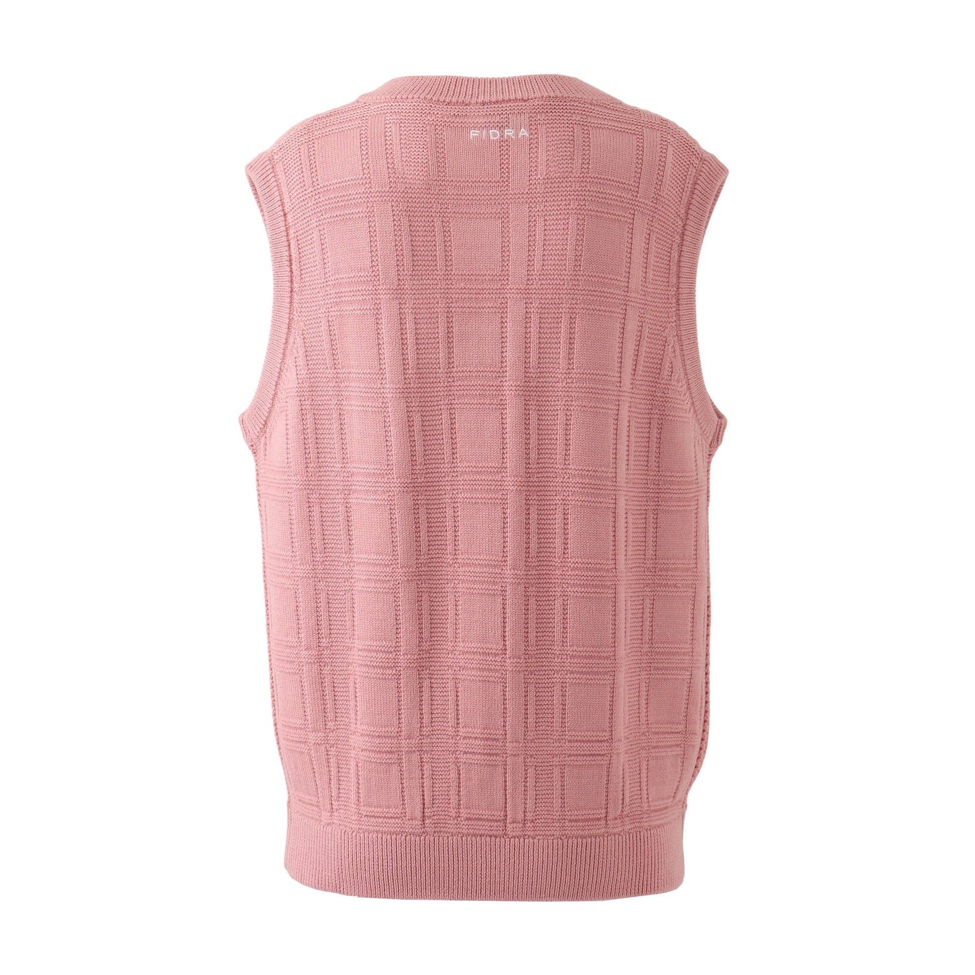 軽量で後ろ見頃にはFIDRAリンクスチェック柄を使用したニットベスト。袖ラインモックネックシャツとコーディネート。